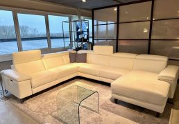 Italiaans salon Rosco van Diva Divani in wit leder. Grote J-combinatie met 2 ingebouwde elektrisch verstelbare relaxen en een longchair. Het salon heeft een onmiskenbaar Italiaans design maar combineert dit met een ophanging op nossagveren. Hierdoor is het zitcomfort stevig en constanter.