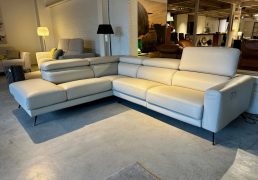 Italiaans hoeksalon in lichtgrijs leder met 1 elektrisch verstelbare relax en manueel verstelbare hoofdsteunen