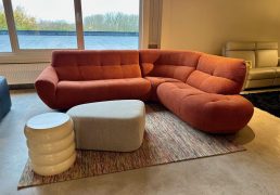 Afgeronde hoekbank in speels baksteenrode stof met zal zitcomfort