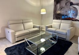 Italiaans modern salon met 3zit met 2 elektrische relaxen en hoofsteunen en 2 manueel verstelbare hoofdsteunen op de 2zit. Hoewel het salon Italiaans van lijn is, werden stevige zitkussen en nosagveren als ophanging gebruikt waardoor een goed ondersteund en constanter zitcomfort wordt bekomen.