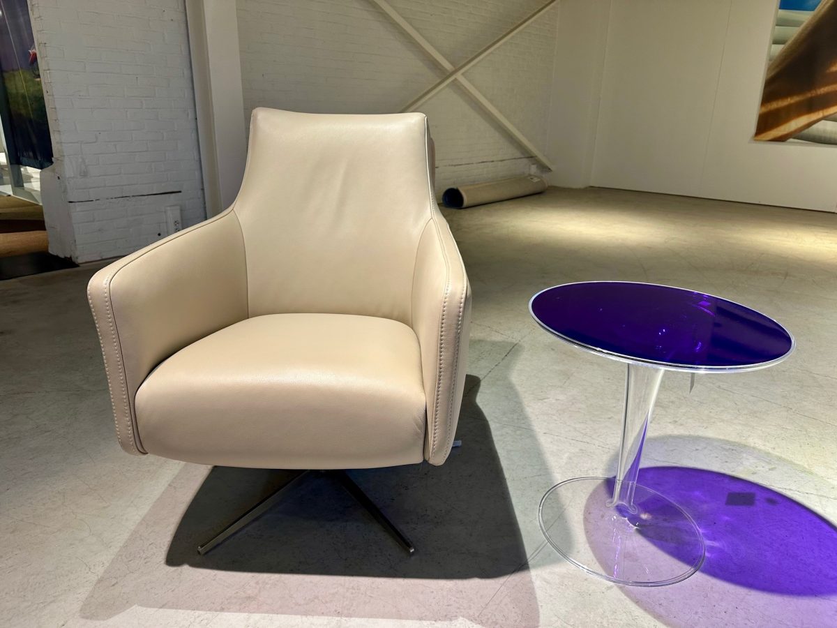 Italiaans design loungesalon met longchair. Compact model met maximale impact. Geïnspireerd door de geroemde designklassieker van Le Corbusier, maar geen kopie. Het pootje met basis werd afgewerkt in verchroomd metaal.