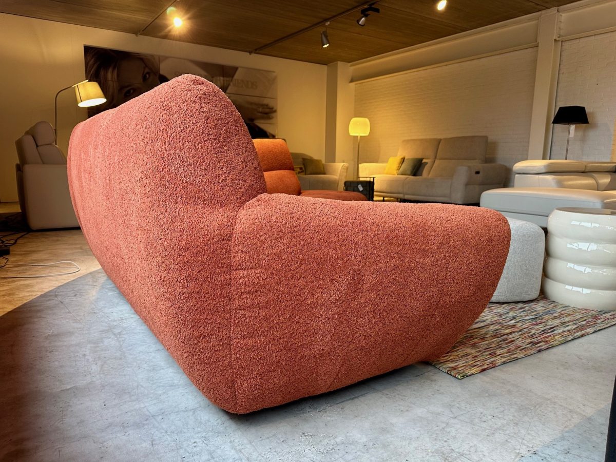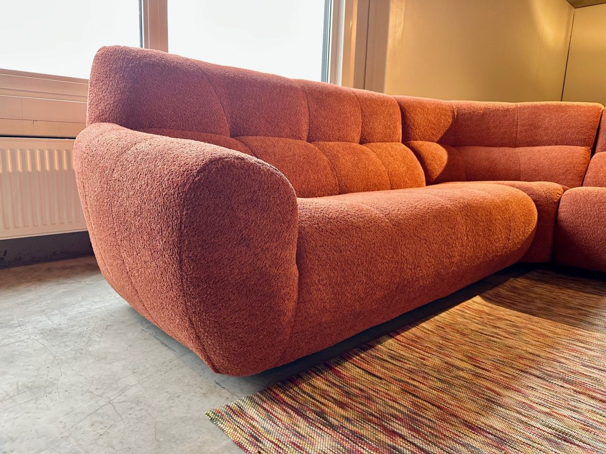 Afgeronde hoekbank in speels baksteenrode stof met zal zitcomfort