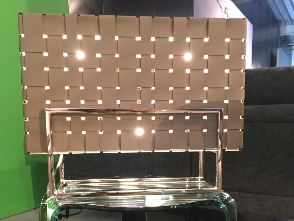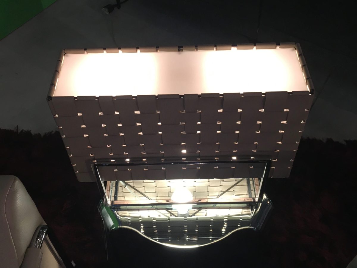 Moderne lamp met twist. De hoekige lampenkap is bekleed met in elkaar geweven zadelleder en geeft een robuste en toch verfijnde sfeer. Het licht straalt zowel door het leder als langs de bovenzijde die met is afgeschermd met PVC in melkvlaskleur. Het frame is verchroomd.